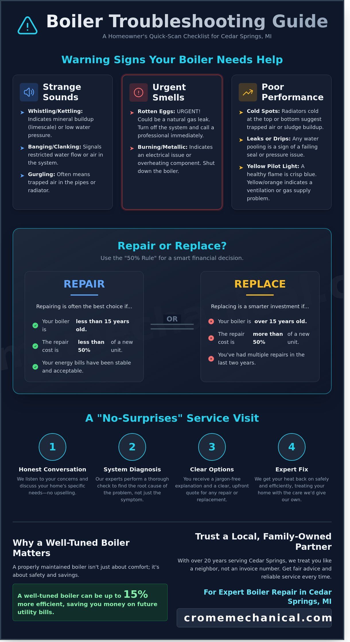 - Use our simple "50% Rule" to decide if a boiler repair Cedar Springs MI is the right move or if it’s finally time for a more reliable upgrade.